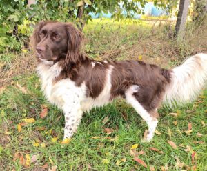 Haar und Formwert: sg/sg, Schulterhöhe 55 cm, braun-weiß